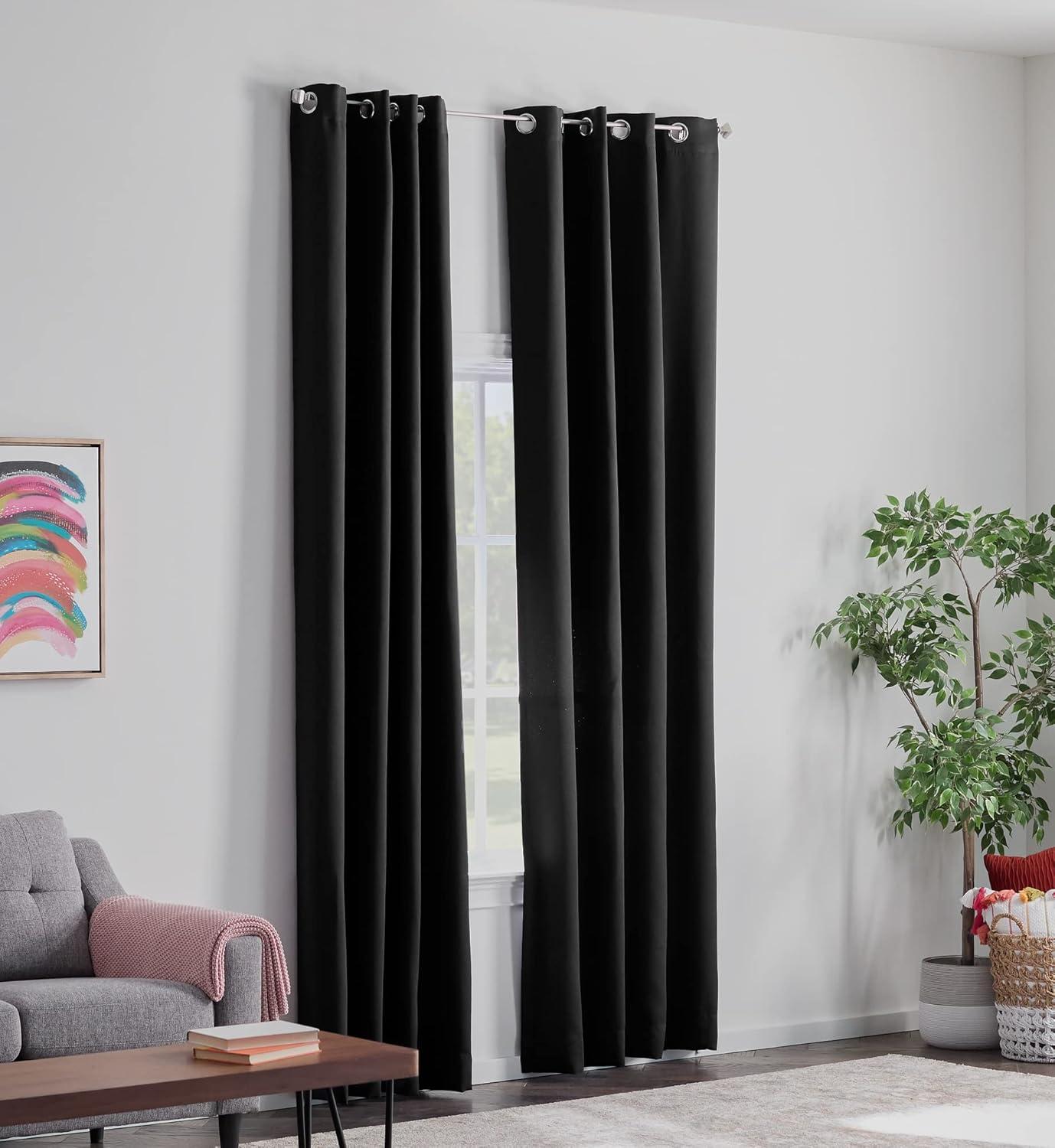 GOODBYE SUNSHINE: Shutout even the brightest light and UV rays with these 85% room-darkening curtains. Triple-weave panels feature a sewn-in layer of black fabric to create blackout effect