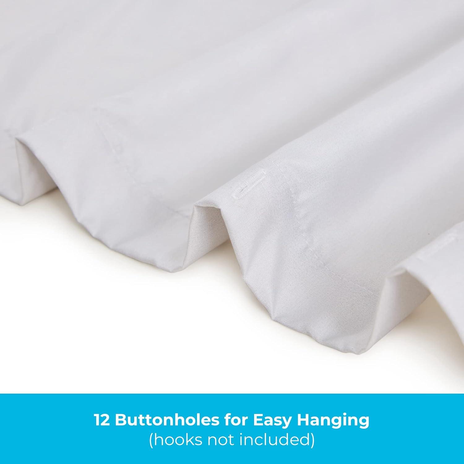 READY TO HANG: Shower curtain designed with 12 stitched buttonholes for rings or hooks and reinforced to reduce tearing. Hooks or rings are not included