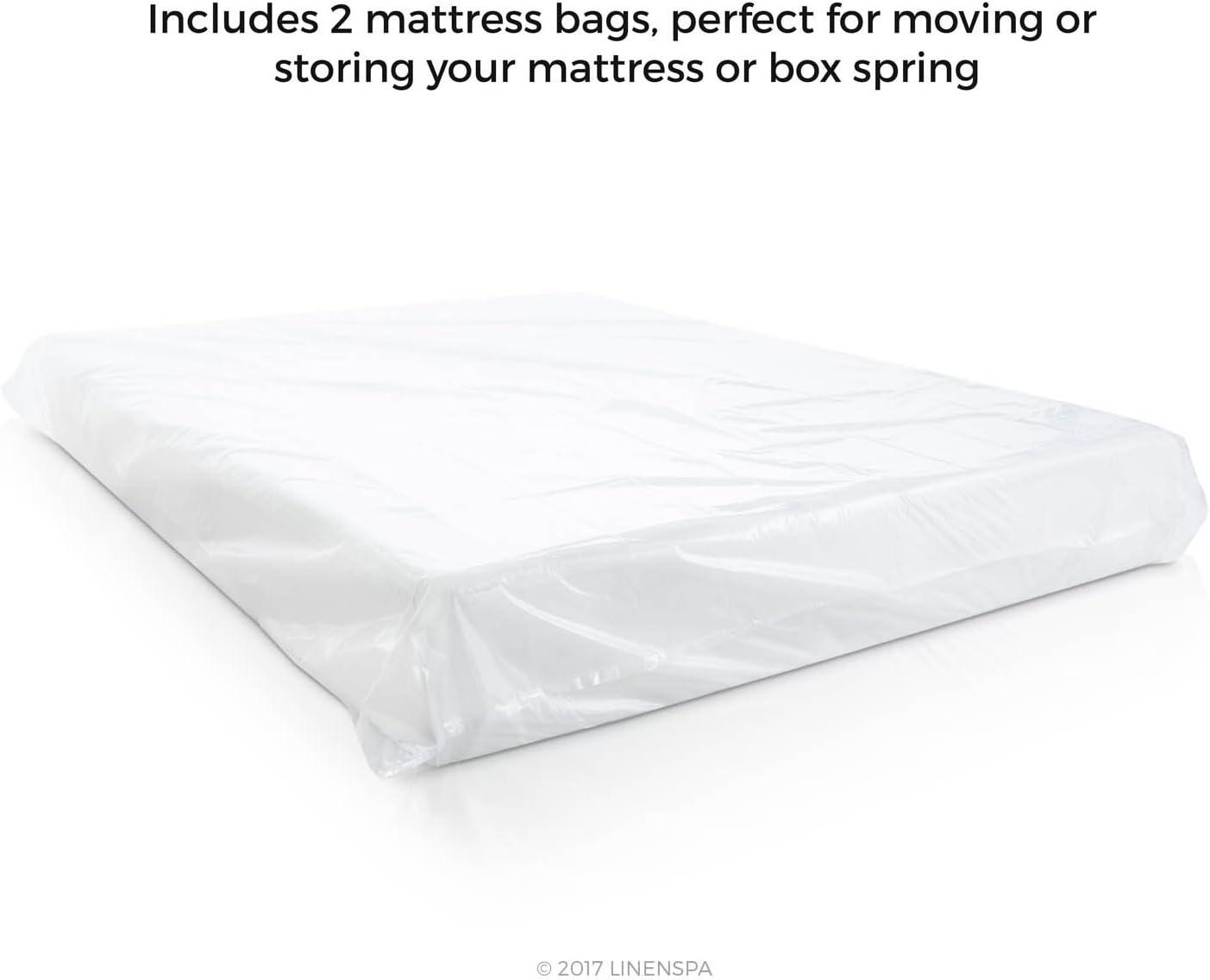 Make moving a breeze with the Linenspa Mattress Bag! This mattress moving bag is constructed of durable tear-resistant material, so you can feel assured that your mattress stays protected. With long lasting protection, this mattress storage bag is the perfect solution for long term storage in your garage, attic, moving truck, or storage unit. It's also a great mattress disposal bag. Use it to dispose of your old mattresses, box springs, or even Christmas trees! Available in three size combinations: Twin/Twin XL, Queen/Full, and King/Cal King. All mattress bags can fit up to 16″ mattresses and box springs. To use, simply place your mattress or box spring in bag, then fold over any extra plastic and secure in place with packing tape for a customized fit.  Stress less knowing your mattress is safe with the Linenspa Mattress Bag. Comes in packs of 2.